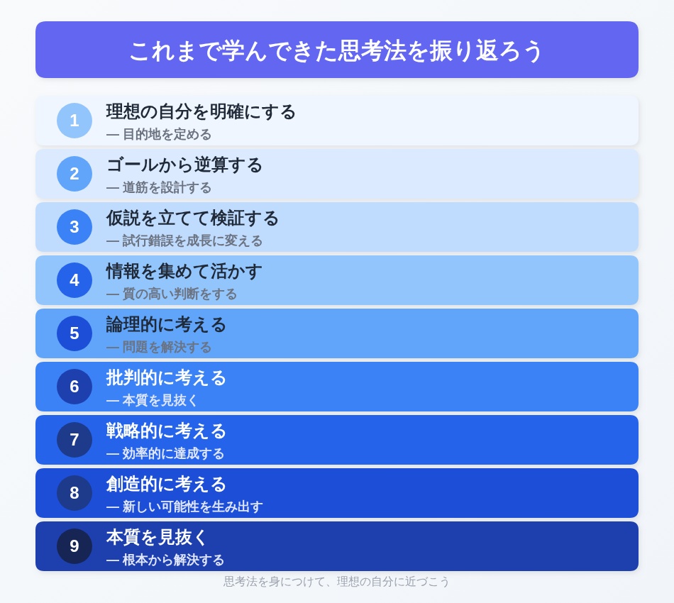 これまで9回にわたって、様々な思考法を学んできた。でも、学んだだけでは人生は変わらない。大切なのは、学んだ知識を実際の行動に変え、習慣化することなんだ。