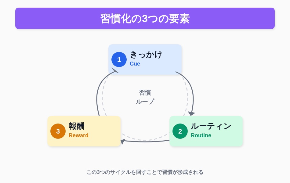 習慣化を成功させるには、この3つを意図的に設計することが重要だ。